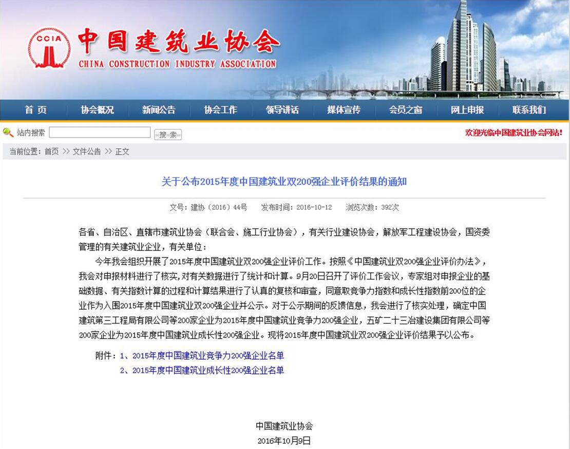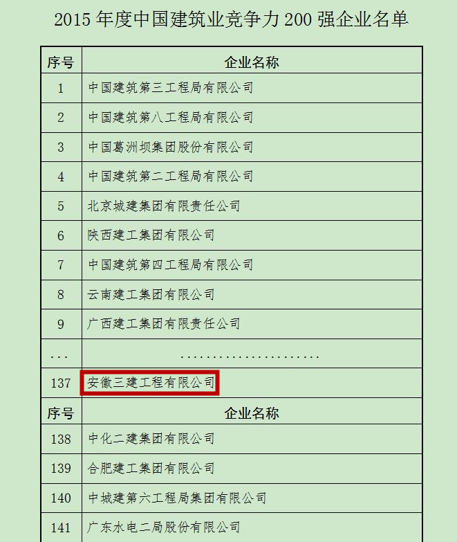 10月12日,經(jīng)過(guò)企業(yè)申報、相關(guān)行業(yè)協(xié)會(huì )推薦、專(zhuān)家組初審、評價(jià)結果公示,中國建筑企業(yè)協(xié)會(huì )終審的“2015年度中國建筑業(yè)雙200強企業(yè)”結果揭曉,安徽三建榜上有名,被授予“2015年度中國建筑業(yè)競爭力200強企業(yè)”稱(chēng)號,這是該司繼連續多年榮獲“中國建筑業(yè)成長(cháng)性百強企業(yè)稱(chēng)號”后的又一含金量極高的榮譽(yù)。