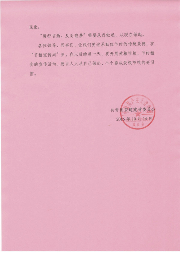 每年的10月16日是世界糧食日,每年世界糧食日所在周為全國愛(ài)惜糧食節約糧食宣傳周。安建建材團委通過(guò)張貼節糧倡議書(shū)、發(fā)放愛(ài)糧節糧宣傳卡片、征集愛(ài)糧節糧宣言等方式廣泛引導、帶動(dòng)全體員工積極參與,大力宣傳愛(ài)糧節糧科學(xué)知識,號召大家養成居安思危、處豐思歉、惜糧如金、節糧成習的良好風(fēng)尚,從我做起、從身邊做起,減少糧食的損失與浪費。