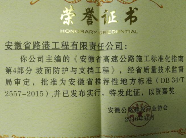 2016年10月31日,安徽省高速公路建設標準化指南編制工作總結表彰會(huì )在省交通質(zhì)監局召開(kāi),省交通廳領(lǐng)導、省交通質(zhì)監局領(lǐng)導、指南編制單位的分管領(lǐng)導、部分編寫(xiě)人員參加了會(huì )議。會(huì )議由省公路建設行業(yè)協(xié)會(huì )主持。安徽路港因主持編寫(xiě)了《安徽省高速公路施工標準化第4部分 坡面防護與支擋工程》(DB34/T2557-2015)在總結會(huì )上獲表彰。