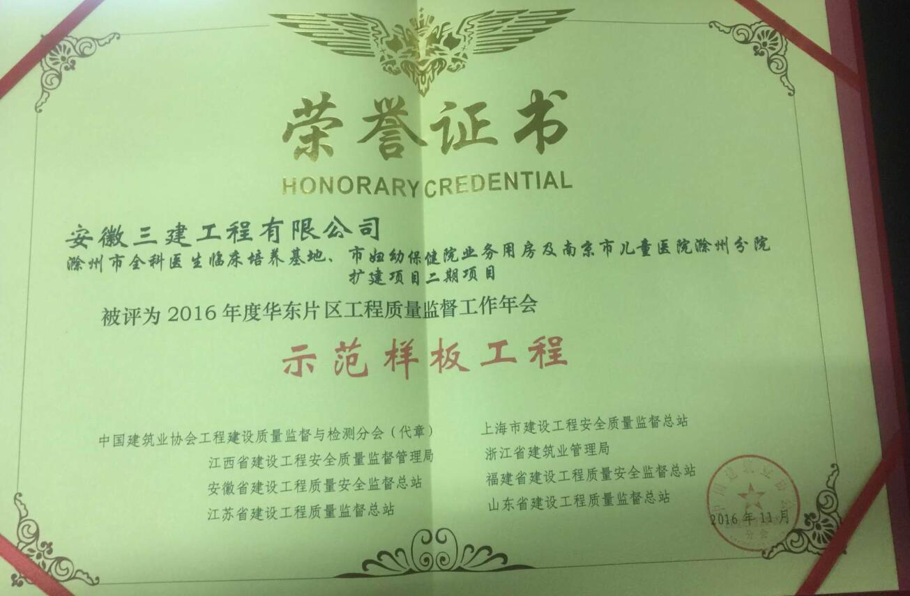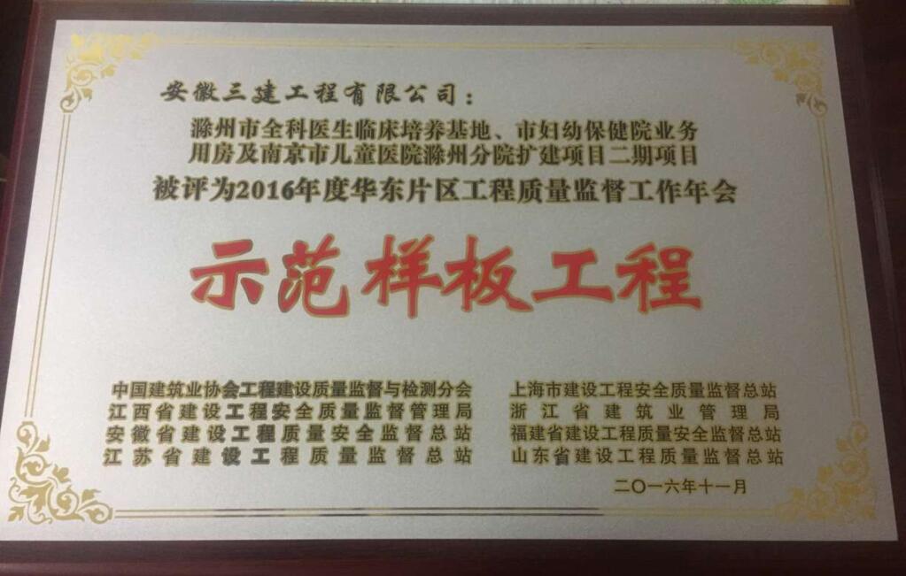 近日,由安徽三建十二公司承建的南京兒童醫院滁州分院工程被評為“2016年華東片區建設工程質(zhì)量監督工作年會(huì )示范樣板工程”,這是該工程繼9月份一次性通過(guò)省級安全質(zhì)量標準化示范工程的又一項重大突破,標志著(zhù)該司項目管理模式進(jìn)入一個(gè)全新階段,已走上質(zhì)量效益型、追求卓越的發(fā)展道路,并得到社會(huì )充分認可。據悉,這是安徽三建公司連續第三年蟬聯(lián)此殊榮,十二分公司首次獲得。