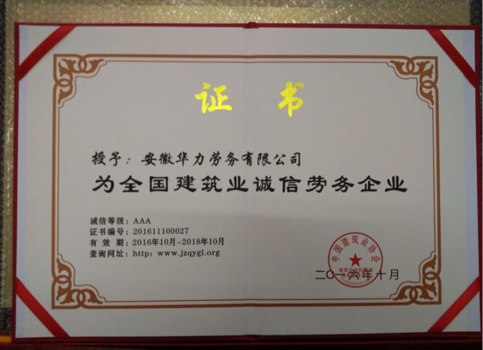 12月22日,在中國建筑業(yè)協(xié)會(huì )主辦的第六屆全國建筑企業(yè)經(jīng)營(yíng)管理交流會(huì )上,安徽三建所屬安徽華力勞務(wù)有限公司被授予“全國AAA級建筑業(yè)誠信勞務(wù)企業(yè)”稱(chēng)號,這是該司繼2014年獲此榮譽(yù)后的又一次獲此殊榮。