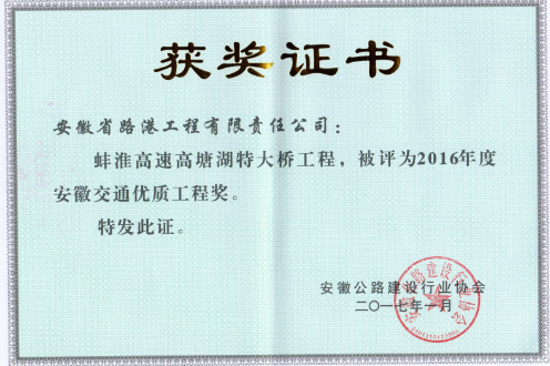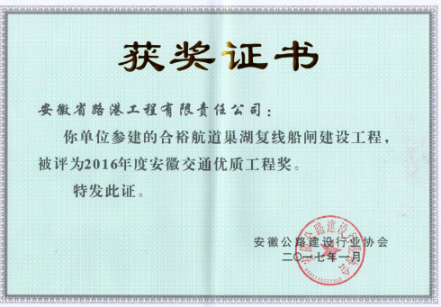 由安徽路港公司承建的合裕航道巢湖復線(xiàn)船閘建設工程、蚌淮高速高塘湖特大橋工程、徐州至明光高速公路安徽段榮獲2016年度“安徽交通優(yōu)質(zhì)工程獎”。
