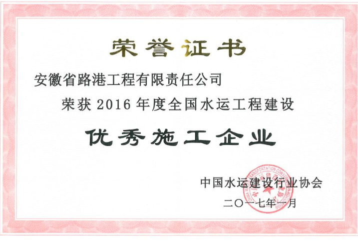 近日,安徽省路港工程有限責任公司獲得“2016年度全國水運建設優(yōu)秀施工企業(yè)”稱(chēng)號,也是公司連續兩年獲得此項殊榮。2016年度,全國僅30家施工企業(yè)獲得該榮譽(yù)。