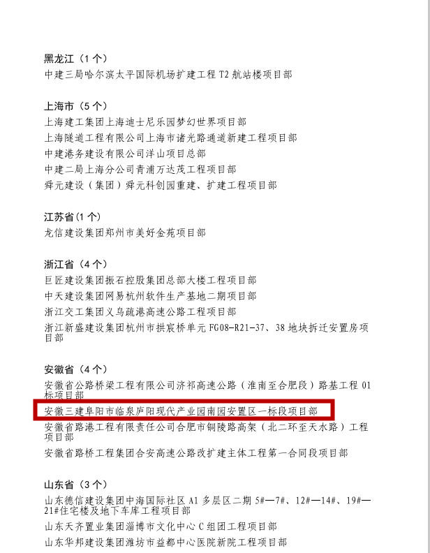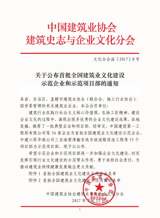 春暖大地,喜訊頻傳。3月15日,中國建筑業(yè)協(xié)會(huì )建筑史志與企業(yè)文化分會(huì )公布了首批56家全國建筑業(yè)文化建設示范企業(yè)和55個(gè)示范項目部名單,安徽三建公司所屬八分公司阜陽(yáng)市臨泉廬陽(yáng)現代產(chǎn)業(yè)園南園安置區一標段項目部榜上有名,同時(shí),安徽建工集團喜獲“全國建筑業(yè)文化建設示范企業(yè)”稱(chēng)號。