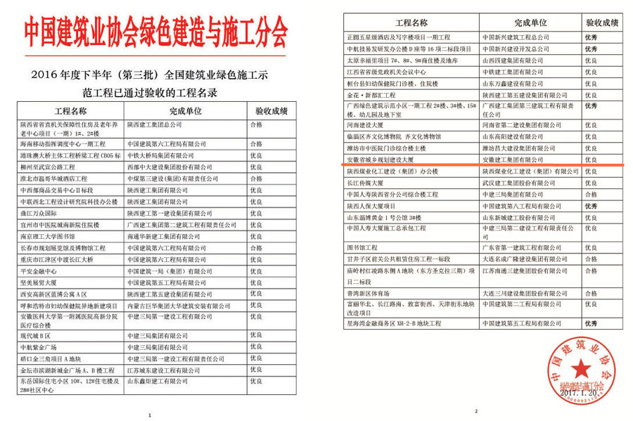 日前,中國建筑業(yè)協(xié)會(huì )綠色建造與施工分會(huì )發(fā)布了2016年度下半年(第三批)全國建筑業(yè)綠色施工示范工程已通過(guò)驗收的工程名單,我公司承建的安徽省城鄉規劃建設大廈工程以?xún)?yōu)良成績(jì)順利通過(guò)驗收。