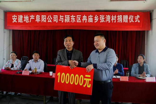 4月18日上午,安建地產(chǎn)阜陽(yáng)公司總經(jīng)理周鑫一行前往阜陽(yáng)市潁東區冉廟鄉政府,向潁東區冉廟鄉張灣村捐贈人民幣十萬(wàn)元,潁東區區委常委、宣傳部部長(cháng)錢(qián)黎麗、潁東區住保局副局長(cháng)張偉以及部分冉廟鄉群眾代表參加了捐贈儀式。