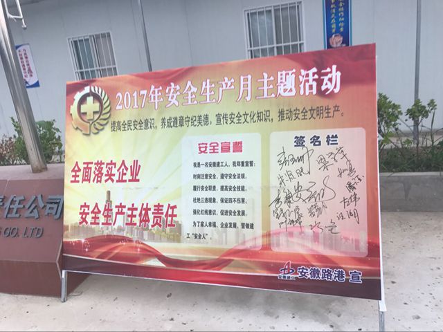 我是一名安徽建工人,我鄭重宣誓:時(shí)刻注意安全,遵守安全法規。履行安全職責,提高安全技能。杜絕三違現象,保證四不傷害。強化紅線(xiàn)意識,促進(jìn)安全發(fā)展。為了家人幸福、企業(yè)發(fā)展,誓做建工“安全人”。錚錚誓言響徹云霄,筆尖揮斥千金承諾。6月1日至2日,安徽路港公司機關(guān)及所屬各單位、項目部莊嚴舉行了2017年“安全生產(chǎn)月”宣誓簽名儀式,拉開(kāi)了今年以“全面落實(shí)企業(yè)安全生產(chǎn)主體責任”為主題的“安全生產(chǎn)月”系列活動(dòng)序幕。