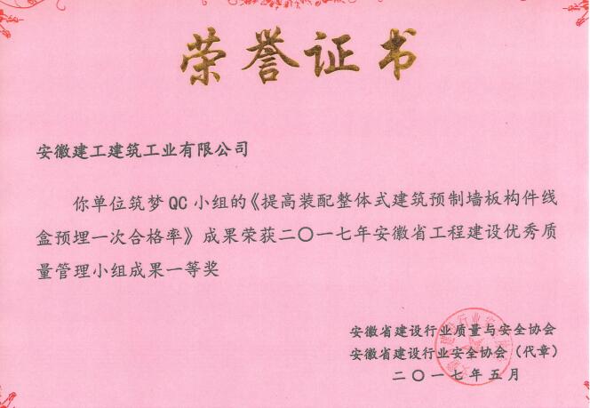 另悉,近期在安徽省建設行業(yè)質(zhì)量與安全協(xié)會(huì )主辦的“2017年安徽省工程建設優(yōu)秀QC小組活動(dòng)成果交流會(huì )”上,建筑工業(yè)公司報送的《提高裝配整體式建筑預制墻板構件線(xiàn)盒預埋一次合格率》QC成果,榮獲2017年安徽省工程建設優(yōu)秀QC小組成果一等獎。標志著(zhù)建筑工業(yè)公司運用全面質(zhì)量管理的理論、方法和工具,有效開(kāi)展質(zhì)量創(chuàng )新和持續改進(jìn),得到行業(yè)的認可。該成果已有效應用到該司生產(chǎn)加工實(shí)踐中,通過(guò)現場(chǎng)作業(yè)證明,既提高了產(chǎn)品質(zhì)量,又取得了良好經(jīng)濟效益。