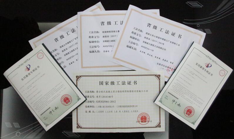 截止目前,該司共計參編完成《預制砼剪力墻外墻板》(15G365-1)和《裝配式混凝土剪力墻結構住宅施工工藝圖解》(16G906)等2項國家建筑標準設計圖集及《裝配式混凝土結構施工及驗收導則》(DBHJ/T014-2014)等7項地方標準。先后榮獲國家級、省級及安徽建工企業(yè)級工法近10項;榮獲國家實(shí)用新型專(zhuān)利成果2項,分別為《一種帶有磁性隔板的預制混凝土構件生產(chǎn)模具工裝》(專(zhuān)利號:ZL201620828541.8)、《一種帶有磁性隔板的預制混凝土構件生產(chǎn)模具》(專(zhuān)利號:ZL201620828553.0);榮獲安徽省科技進(jìn)步二等獎1個(gè),“疊合板式鋼筋混凝土剪力墻結構抗震關(guān)鍵技術(shù)”,另有2項發(fā)明專(zhuān)利已經(jīng)通過(guò)實(shí)質(zhì)性審查。