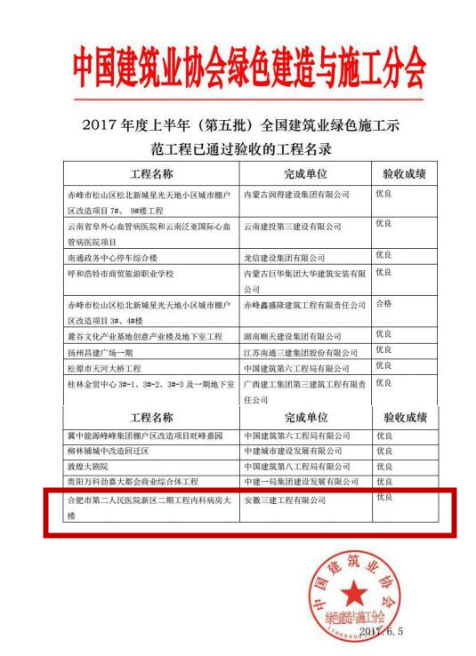 6月6日,由中國建筑業(yè)協(xié)會(huì )綠色建造與施工分會(huì )組織對通過(guò)綠色施工過(guò)程驗收的項目進(jìn)行竣工評審。由安徽三建承建的“合肥市第二人民醫院新區二期工程內科病房大樓”項目以?xún)?yōu)良成績(jì)順利通過(guò)竣工評審,順利獲評"全國建筑業(yè)綠色施工示范工程"。