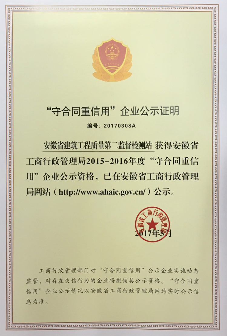 近日,經(jīng)安徽省工商行政管理局評定公示,安徽省建科院、省質(zhì)檢二站榮獲2015-2016年度省級“守合同重信用”企業(yè)榮譽(yù)稱(chēng)號。