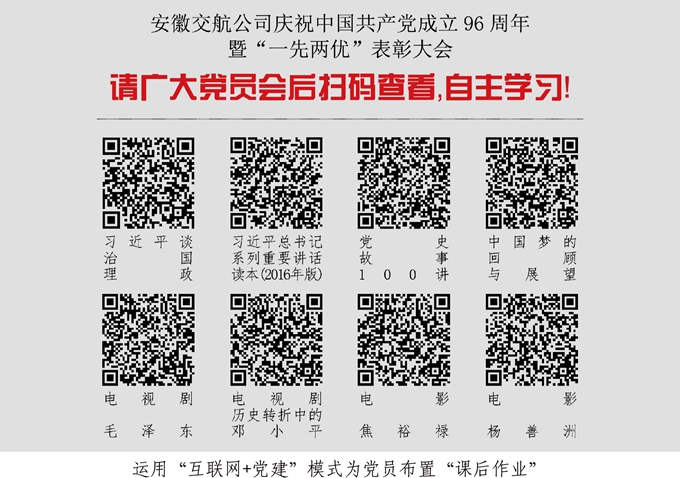 會(huì )后,安徽交航公司黨委為全體黨員布置了“課外作業(yè)”,即利用業(yè)余時(shí)間掃描二維碼自主學(xué)習習近平總書(shū)記系列重要講話(huà)特別是視察安徽重要講話(huà)精神以及黨的光輝歷史和最新時(shí)事政治。近年來(lái),隨著(zhù)“互聯(lián)網(wǎng)+”思維的不斷深化,安徽交航公司黨委有效運用“互聯(lián)網(wǎng)+黨建”模式開(kāi)展各項工作,積極把“互聯(lián)網(wǎng)+”思維內化為創(chuàng )新黨建工作的驅動(dòng)力,主動(dòng)搶占“指尖陣地”,努力打造“口袋黨建”!
