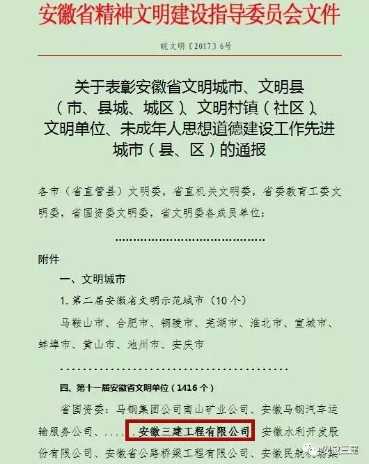6月20日,安徽省精神文明建設指導委員會(huì )發(fā)布了《關(guān)于表彰安徽省文明城市、文明縣(市、縣城、城區)、文明村鎮(社區)、文明單位、未成年人思想道德建設工作先進(jìn)城市(縣、區)的通報》(皖文明【2017】6號),安徽三建公司喜獲第十一屆安徽省文明單位榮譽(yù)稱(chēng)號。這是我公司第五次榮獲“安徽省文明單位”稱(chēng)號,是公司文明創(chuàng )建工作取得的又一成果。同時(shí),兄弟單位安徽水利、安徽路橋也榜上有名。