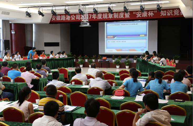 7月5日下午,安徽路港公司2017年度規章制度暨“安康杯”知識競賽在安建大廈3樓舉行,共有來(lái)自公司機關(guān)、司屬各單位的24支參賽隊伍、72名職工參加比賽。集團工會(huì )副主席吳曉伍、調研員胡愛(ài)紅應邀出席并做點(diǎn)評,安徽路港公司董事長(cháng)、總經(jīng)理李振標,紀委書(shū)記、工會(huì )主席干戈觀(guān)看了本次競賽。