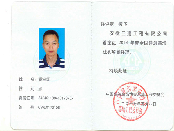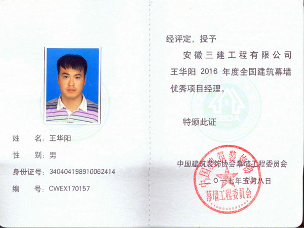 2017年6月在第十屆中國建筑幕墻設計師大會(huì )上,安徽三建裝飾公司王華陽(yáng)、潘寶紅兩位同志榮獲“2017年中國建筑幕墻優(yōu)秀項目經(jīng)理”稱(chēng)號。同時(shí)安徽省建筑裝飾協(xié)會(huì )在其官網(wǎng)上發(fā)布喜訊:該司萬(wàn)和生、高莉等11名同志榮獲“2015-2016年度安徽省建筑裝飾優(yōu)秀項目經(jīng)理”稱(chēng)號。