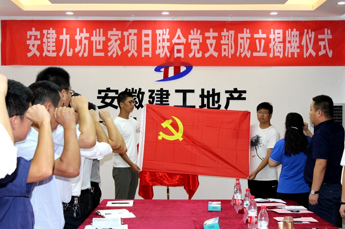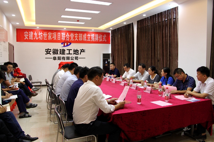 2017年7月25日上午,安建·九坊世家項目聯(lián)合黨支部揭牌儀式在九坊世家售樓中心會(huì )議室圓滿(mǎn)舉行。安徽水利黨委副書(shū)記、紀委書(shū)記戴樹(shù)明,安徽三建黨委副書(shū)記黃麗春,安建地產(chǎn)黨委委員、紀委書(shū)記陳小群,建工集團黨委工作部陳楠等出席了儀式。安建地產(chǎn)阜陽(yáng)公司黨支部書(shū)記、總經(jīng)理周鑫主持儀式。