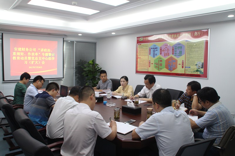 7月26日上午,安建財務(wù)公司召開(kāi) “講政治、重規矩、作表率”專(zhuān)題警示教育動(dòng)員暨黨總支中心組學(xué)習(擴大)會(huì )。會(huì )議由公司黨總支書(shū)記、副總經(jīng)理潘琳主持,總經(jīng)理、黨總支副書(shū)記李有貴,副總經(jīng)理、紀檢委員于忠山出席了會(huì )議。公司機關(guān)中層管理人員,保理公司、小貸公司黨支部書(shū)記及支委參加了會(huì )議。
