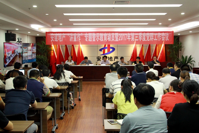 2017年7月28日,安建地產(chǎn)“講重作”專(zhuān)題警示教育動(dòng)員暨2017年第三季度黨群工作例會(huì )在安建國際大廈21樓第三會(huì )議室召開(kāi),公司領(lǐng)導班子成員、各支部書(shū)記、各辦事處負責人、公司機關(guān)全體黨員、設計院支部全體黨員參加會(huì )議,安建地產(chǎn)黨委委員、紀委書(shū)記陳小群主持會(huì )議。