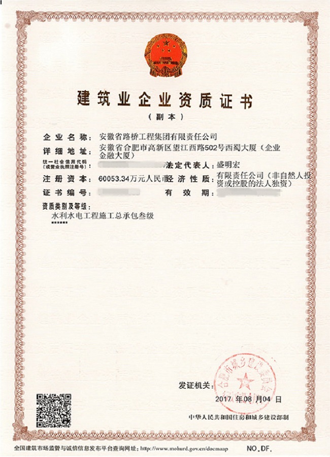 8月4日,經(jīng)合肥市城鄉建設委員會(huì )核準,公司成功取得水利水電三級資質(zhì)證書(shū)。該資質(zhì)的取得,為安徽路橋集團進(jìn)軍水利水電市場(chǎng)邁出了堅實(shí)的第一步,拓寬了公司的發(fā)展空間。