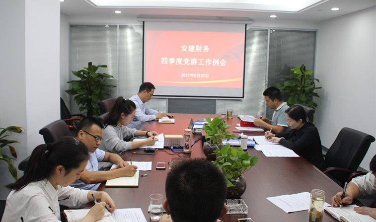 9月27日,安建財務(wù)公司黨總支組織召開(kāi)了四季度黨群工作例會(huì )。會(huì )議由黨總支書(shū)記、副總經(jīng)理潘琳主持,公司黨總支委員、副總經(jīng)理于忠山出席會(huì )議。公司黨群部門(mén)相關(guān)人員及所屬各單位黨支部書(shū)記、支委等參加會(huì )議。