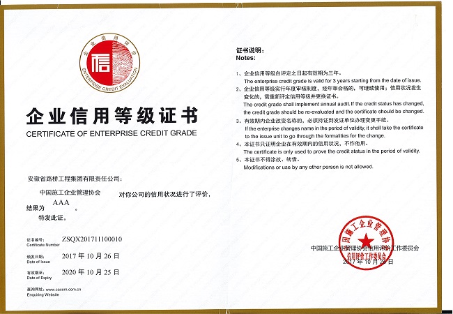 11月23日,中國施工企業(yè)管理協(xié)會(huì )于北京召開(kāi)2017年工程建設誠信企業(yè)推薦大會(huì )。會(huì )上公布表彰了工程建設誠信典企型業(yè)和AAA信用等級企業(yè),并進(jìn)行現場(chǎng)授牌。路橋集團獲得AAA級企業(yè)信用等級,被評為AAA級信用企業(yè)。