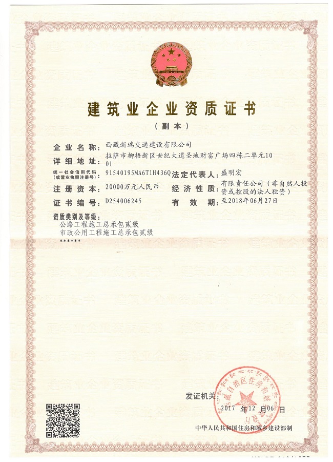 在集團公司的正確領(lǐng)導及大力支持下,為進(jìn)一步擴大公司在西藏業(yè)務(wù)承接范圍,提升市場(chǎng)競爭力, 2017年年初公司正式確立了資質(zhì)增項的年度工作目標,并于年初著(zhù)手完善各種申報資料,加強公司員工技能培訓,加大技術(shù)力量和人才招聘。經(jīng)過(guò)西藏自治區住建廳的層層嚴格審核后,終于于12月上旬迎來(lái)新突破,成功取得了市政公用工程施工總承包貳級資質(zhì)證書(shū)。