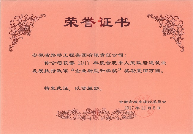 12月26日,合肥市城鄉建設委員會(huì )組織召開(kāi)了2017年合肥市建筑業(yè)轉型發(fā)展座談會(huì ),會(huì )上頒發(fā)了2017年度合肥市人民政府建筑業(yè)發(fā)展扶持政策“企業(yè)轉型升級獎”榮譽(yù)證書(shū),公司參加座談會(huì )并獲得此殊榮,獲得獎勵資金100萬(wàn)元。