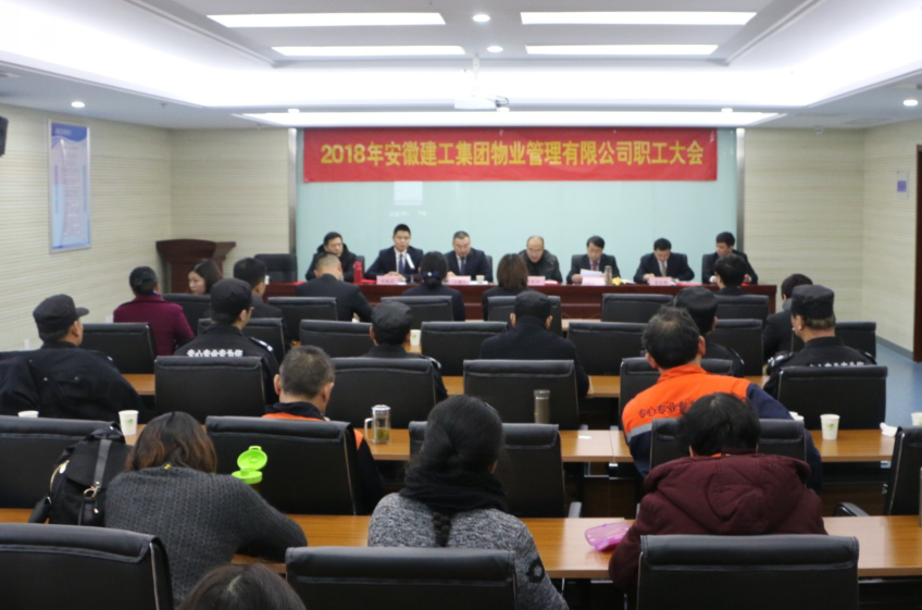 1月21日,安徽建工集團物業(yè)管理有限公司在安建大廈召開(kāi)公司2018年職工大會(huì )。安徽建工服務(wù)中心黨總支書(shū)記、總經(jīng)理盧躍華同志,安徽建工服務(wù)中心副總經(jīng)理、建工物業(yè)黨支部書(shū)記、董事長(cháng)王金宏同志,總經(jīng)理張振武同志,安徽建工服務(wù)中心工會(huì )副主席、綜合部主任徐斌同志等出席會(huì )議。