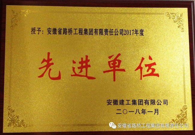 1月31日,在集團公司一屆四次職代會(huì )暨2018年工作會(huì )上,安徽路橋集團被授予集團公司2017年度先進(jìn)單位榮譽(yù)稱(chēng)號,這是公司連續兩年獲此榮譽(yù)。