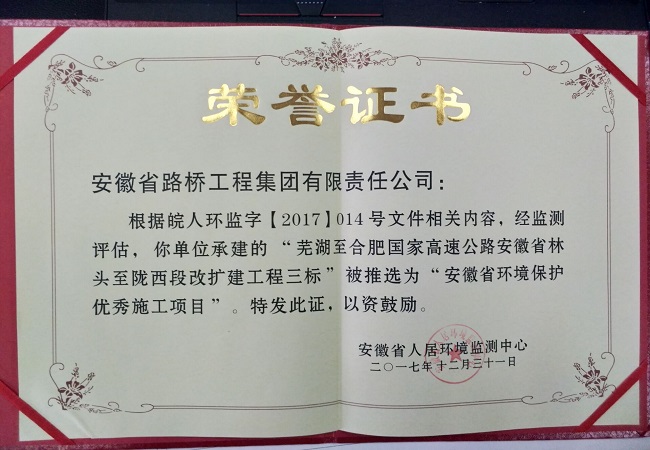 近日,我公司承建的蕪合高速改擴建03標項目部在安徽省人民環(huán)境監測中心開(kāi)展的2017年度評選中,喜獲“安徽省環(huán)境保護優(yōu)秀施工項目”榮譽(yù)。