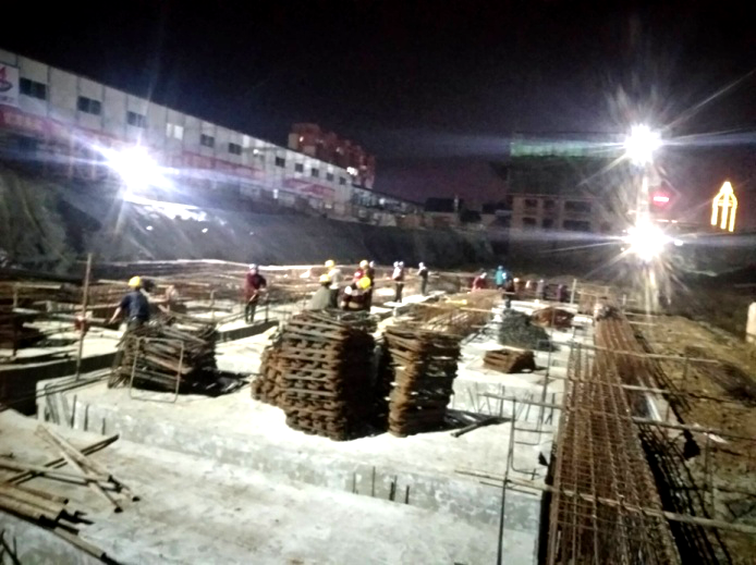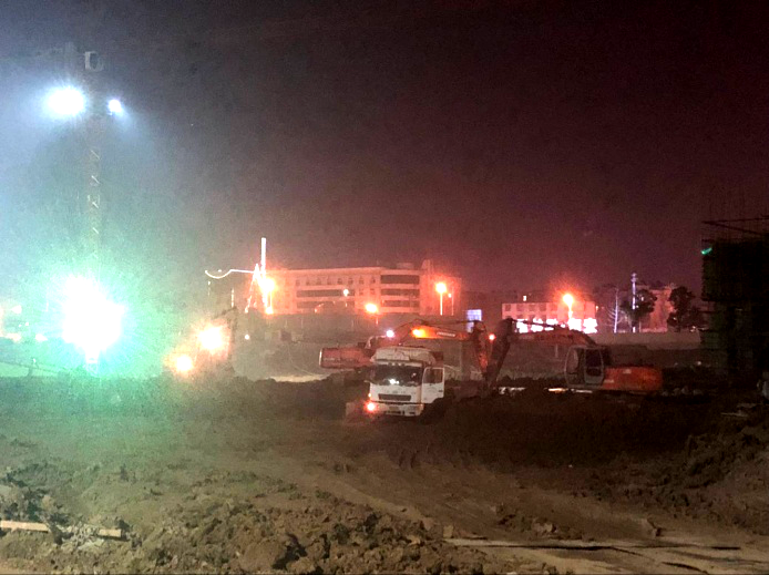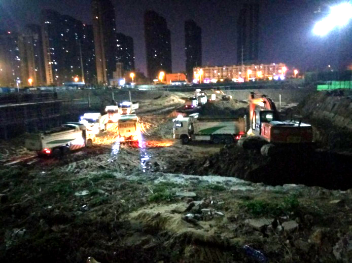 為確保安全文明生產(chǎn),針對項目施工現場(chǎng),全面開(kāi)展安全巡查、排查工作,全力確?;咏邓?、邊坡支護、臨時(shí)用電、腳手架等重點(diǎn)部位無(wú)安全隱患。在施工現場(chǎng)配備足夠的照明設備以滿(mǎn)足挖機、渣土車(chē)、塔吊等機械設備夜間作業(yè),并設專(zhuān)職安全員執勤。
