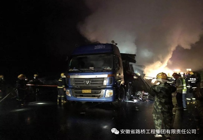 5月12日晚22點(diǎn)50分,合安高速往合肥方向1053+100路段有車(chē)輛著(zhù)火,占據了超車(chē)道和行車(chē)道,導致往合肥方向交通雙向中斷?,F場(chǎng)火勢很大,并伴有清晰的爆裂聲。形勢危急,合安項目部副經(jīng)理李虎、安全部總監楊林第一時(shí)間趕到現場(chǎng)指揮救援,安全部以及拌合站工作人員也趕到現場(chǎng),積極配合消防隊、交管隊進(jìn)行火災搶險行動(dòng)。經(jīng)過(guò)一夜奮戰,大火最終被撲滅。7點(diǎn)26分,消防隊二次進(jìn)場(chǎng)將余火撲滅后,合安項目部立即組織工作人員快速清理現場(chǎng),保證了道路的通暢。