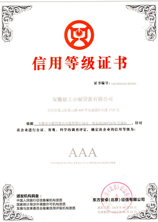 繼2017年安徽建工小額貸款有限公司(以下簡(jiǎn)稱(chēng)安建小貸)首次榮獲行業(yè)最高“AAA”等級信用證書(shū)之后,安建小貸全體員工再接再厲、共謀發(fā)展,于2018年6月,再次榮獲行業(yè)最高“AAA”等級信用證書(shū)。這是充分體現了省、市、區各級金融監管部門(mén)對安建小貸經(jīng)營(yíng)管理、風(fēng)險控制、業(yè)務(wù)模式等各項基礎工作的認可,也是對安建小貸從事集團內部供應鏈業(yè)務(wù)的高度肯定。按照相關(guān)制度規定,“AAA”資質(zhì)將有助于安建小貸增加經(jīng)營(yíng)范圍,形成靈活多樣的產(chǎn)品品種,滿(mǎn)足客戶(hù)不同需求;有助于拓寬融資渠道,提高杠桿水平,以及有助于公司在政商環(huán)境中的認可度等。