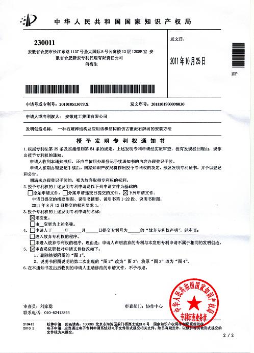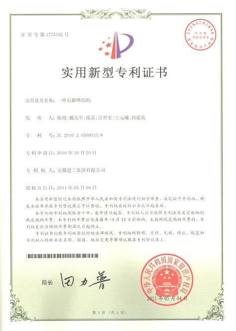 近日,國家知識產(chǎn)權局授予安徽建工集團有限公司“一種石雕榫結構”實(shí)用新型專(zhuān)利權(專(zhuān)利號:ZL 2010 2 0569013.8),并頒發(fā)了實(shí)用新型專(zhuān)利證書(shū)。同時(shí),“一種石雕榫結構及應用該榫結構的仿古徽派石牌坊的安裝方法”已通過(guò)國家知識產(chǎn)權局發(fā)明專(zhuān)利實(shí)質(zhì)審查,并被授予國家發(fā)明專(zhuān)利權通知書(shū),即將頒發(fā)發(fā)明專(zhuān)利證書(shū)。
