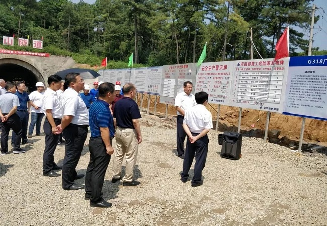 8月6日上午,廣德縣縣委書(shū)記王慶武、縣長(cháng)陳紅英、縣人大主任程利、縣政協(xié)主席周鳳月及縣委、縣政府、人大、政協(xié)等相關(guān)領(lǐng)導同志一行70余人,蒞臨G318廣德縣繞城段公路改建工程項目,視察橫山隧道。項目業(yè)主、監理及施工單位相關(guān)負責人陪同縣領(lǐng)導地參觀(guān)施工現場(chǎng),觀(guān)摩現場(chǎng)安全、施工介紹展板,聽(tīng)取了G318廣德繞城路有關(guān)介紹與進(jìn)度情況、工作計劃。
