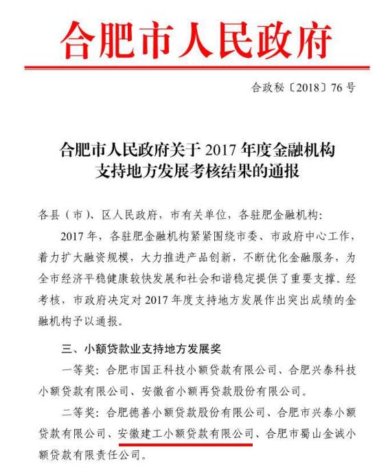 近日《合肥市人民政府關(guān)于2017年度金融機構支持地方發(fā)展考核結果的通報》發(fā)布,安徽建工小額貸款有限公司榮獲金融機構支持地方發(fā)展獎二等獎。這是公司繼去年榮獲該類(lèi)別三等獎之后,再次獲得合肥市政府的通報表彰。獎項的榮獲代表著(zhù)市政府及金融監管部門(mén)對安建小貸近年規范經(jīng)營(yíng)、服務(wù)小微并取得跨越發(fā)展的認可和鼓勵;代表著(zhù)公司不斷優(yōu)化金融服務(wù)、為全市經(jīng)濟和社會(huì )穩定做出貢獻的肯定;更代表著(zhù)公司已經(jīng)在全市、全行業(yè)范圍內樹(shù)立了優(yōu)質(zhì)的形象和獲得了良好的聲譽(yù)。