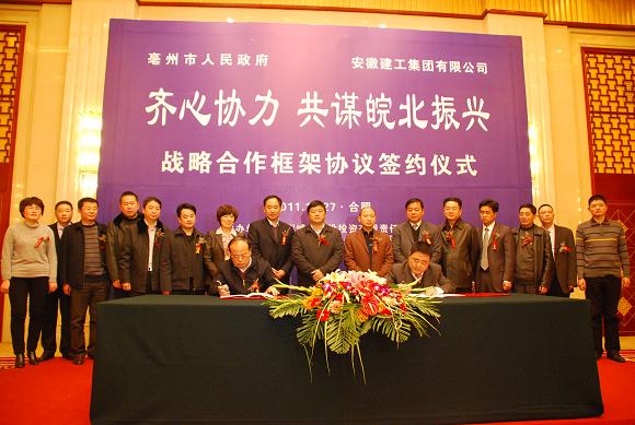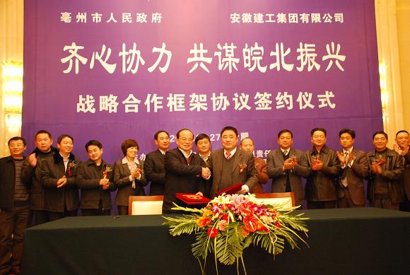胡運成董事長(cháng)在致辭中指出,隨著(zhù)工業(yè)化進(jìn)程的顯著(zhù)加快和城市化水平的快速提升,亳州市勞動(dòng)力資源豐富和投資環(huán)境優(yōu)良的優(yōu)勢日益凸顯,加之省委、省政府密集出臺支持皖北地區發(fā)展的一系列政策措施,亳州必將迎來(lái)新的黃金發(fā)展機遇期。亳州市的加快發(fā)展對市場(chǎng)建設規模、建筑業(yè)管理水平和專(zhuān)業(yè)技術(shù)人才提出了更高的要求。在當前“和諧發(fā)展、全面轉型、加速崛起、興皖富民”的大背景和省委、省政府大力支持皖北地區經(jīng)濟發(fā)展的良好機遇下,安徽建工正在致力于實(shí)現“安徽建筑的創(chuàng )新服務(wù)領(lǐng)導者”的戰略愿景。同時(shí),安徽建工擁有雄厚的資本、成熟的項目管理和工程施工經(jīng)驗以及大批優(yōu)秀的專(zhuān)業(yè)技術(shù)人員,在業(yè)內具有優(yōu)質(zhì)的品牌和顯著(zhù)的業(yè)績(jì)。因此,雙方的互補優(yōu)勢明顯,合作前景廣闊。安徽建工與亳州市政府建立戰略合作關(guān)系,既是亳州市委、市政府對安徽建工的信任,也是安徽建工支持亳州市建筑業(yè)義不容辭的責任。這對于發(fā)揮省屬大型骨干建筑企業(yè)的帶動(dòng)力和輻射力,提升亳州建筑業(yè)發(fā)展水平,促進(jìn)經(jīng)濟社會(huì )實(shí)現率先突破發(fā)展具有重大意義。