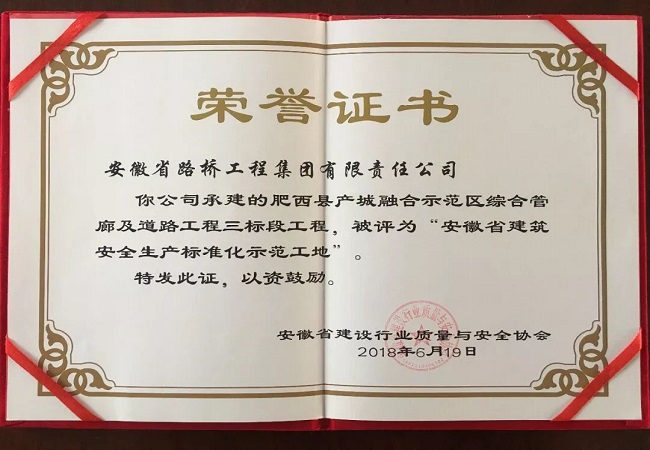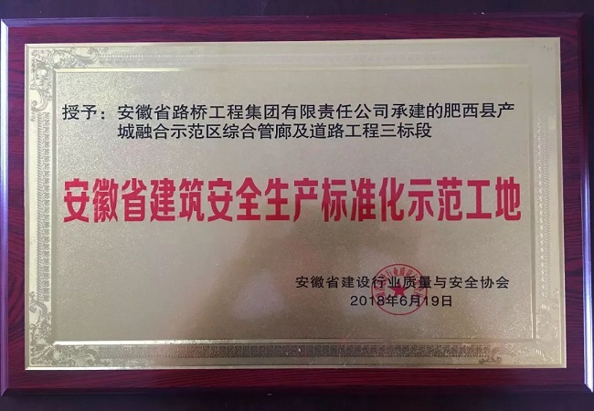 6月19日,安徽省建設行業(yè)質(zhì)量與安全協(xié)會(huì )下發(fā)了2018年度第一批安徽省建筑安全生產(chǎn)標準化示范工地(小區)名單,并于近日完成了授牌。公司承建的肥西縣產(chǎn)城融合示范區綜合管廊及道路工程三標段項目榮獲“省級安全生產(chǎn)標準化示范工地”稱(chēng)號。