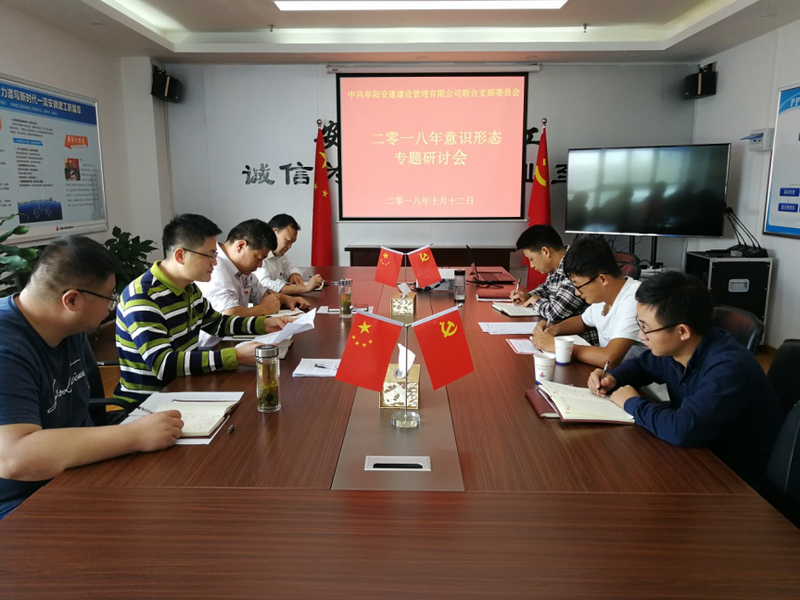 10月12日上午,安建投資阜陽(yáng)安建建設管理有限公司聯(lián)合黨支部召開(kāi)2018年意識形態(tài)專(zhuān)題研討會(huì )。會(huì )議對上一階段意識形態(tài)工作進(jìn)行了全面總結,并對下一階段工作進(jìn)行了安排部署。聯(lián)合支部書(shū)記蔡方紅主持會(huì )議,支部支委班子成員參加會(huì )議并就多個(gè)問(wèn)題展開(kāi)熱烈討論。