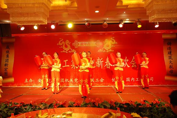 集團公司董事長(cháng)、黨委書(shū)記胡運成首先致新春賀詞,他高度肯定了2011年集團公司在各方面取得的成績(jì),對全體員工表示慰問(wèn),并預祝大家新春愉快、闔家歡樂(lè )!聯(lián)歡會(huì )在國內工程公司表演的舞蹈《好運來(lái)》中拉開(kāi)序幕,職工們自編自導、傾情表演了歌曲、小品、雙簧、舞蹈等豐富多彩的節目,表達了對集團公司取得今天成就的驕傲,更充分展示了對集團公司明天取得更加輝煌業(yè)績(jì)的堅定信心和為之奮斗的決心。聯(lián)歡會(huì )上,還播放了經(jīng)濟實(shí)體領(lǐng)導、海外及安建大廈等基層一線(xiàn)項目員工、機關(guān)及實(shí)體龍年生肖員工的新年祝福視頻,贏(yíng)得了大家陣陣掌聲。集團公司領(lǐng)導上臺為本命年的員工派發(fā)了新年吉祥物。整場(chǎng)聯(lián)歡會(huì )沉浸在祥和、喜慶、熱烈的氣氛中。