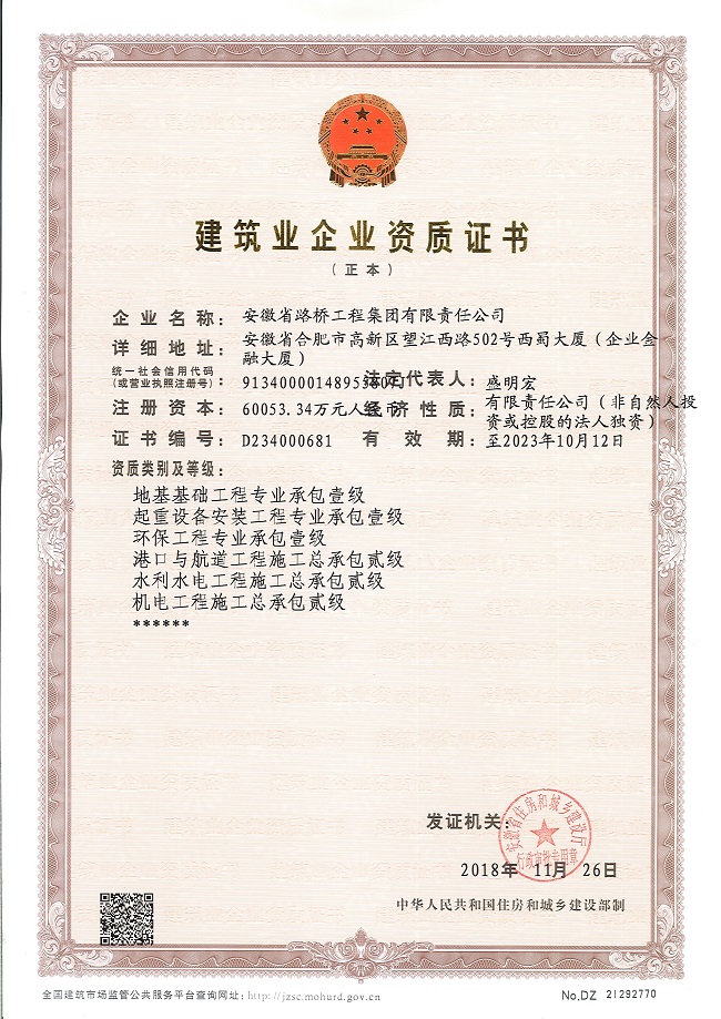 安徽路橋集團人努力拼搏、不斷進(jìn)取再獲碩果。11月26日,公司再傳喜訊,經(jīng)安徽省住房和城鄉建設廳核準,公司成功取得起重設備安裝工程專(zhuān)業(yè)承包一級、地基基礎工程專(zhuān)業(yè)承包一級、機電工程施工總承包二級資質(zhì)證書(shū)。這是繼十月份,公司新增環(huán)保專(zhuān)業(yè)承包一級、港口與航道工程施工總承包二級、水利水電工程總承包二級資質(zhì)后的又一次增項。此次增項的資質(zhì)以房建資質(zhì)為主,為公司未來(lái)進(jìn)入房建領(lǐng)域奠定了良好的基礎,此次資質(zhì)的獲得將進(jìn)一步拓展公司業(yè)務(wù)范圍,提高企業(yè)核心競爭力。