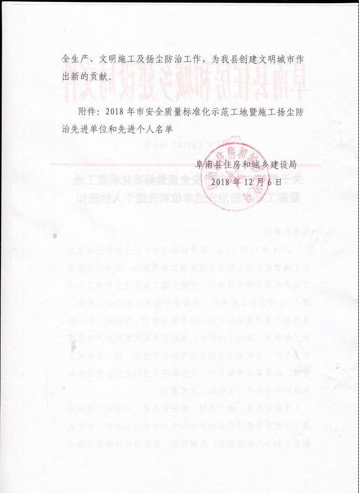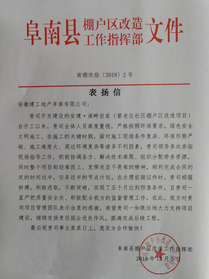12月5日、12月6日,安建地產(chǎn)阜南公司分別收到阜南縣棚戶(hù)區改造工作指揮部、阜南縣住房和城鄉建設局致信表?yè)P,表彰安建地產(chǎn)·淮畔世家(曾老莊社區棚戶(hù)區改造項目)按照環(huán)保要求,綠色安全文明施工并按期完成合同約定節點(diǎn)目標,為整個(gè)項目順利實(shí)現交付使用贏(yíng)得了時(shí)間,做出了貢獻。