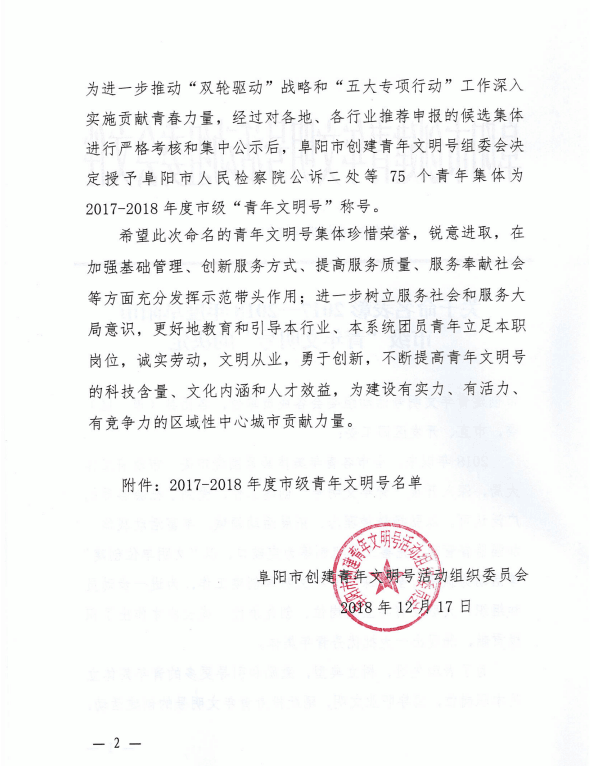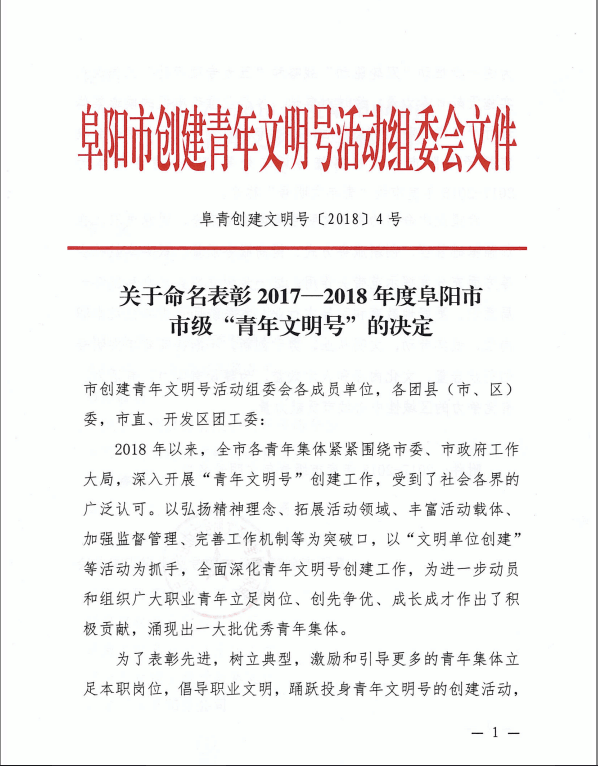近日,安建地產(chǎn)阜陽(yáng)公司榮獲“2017—2018年度阜陽(yáng)市市級青年文明號”榮譽(yù)稱(chēng)號,并且是阜陽(yáng)市唯一獲此稱(chēng)號的房地產(chǎn)公司。