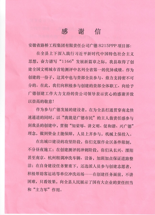 近日,公司收到廣德縣交通運輸局發(fā)來(lái)的感謝信。信中對安徽路橋集團廣德S15PPP項目部保質(zhì)保量完成項目建設目標給予充分認可和高度贊譽(yù),并對公司為廣德縣發(fā)展作出的努力和貢獻表示衷心感謝。