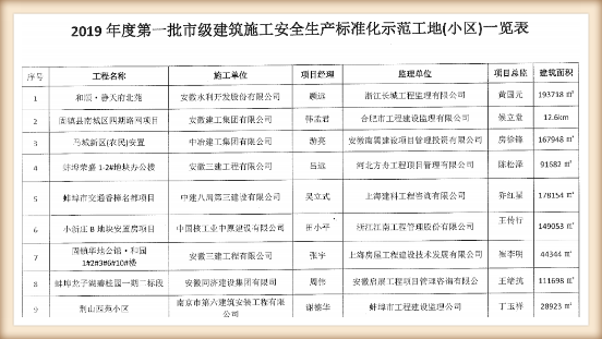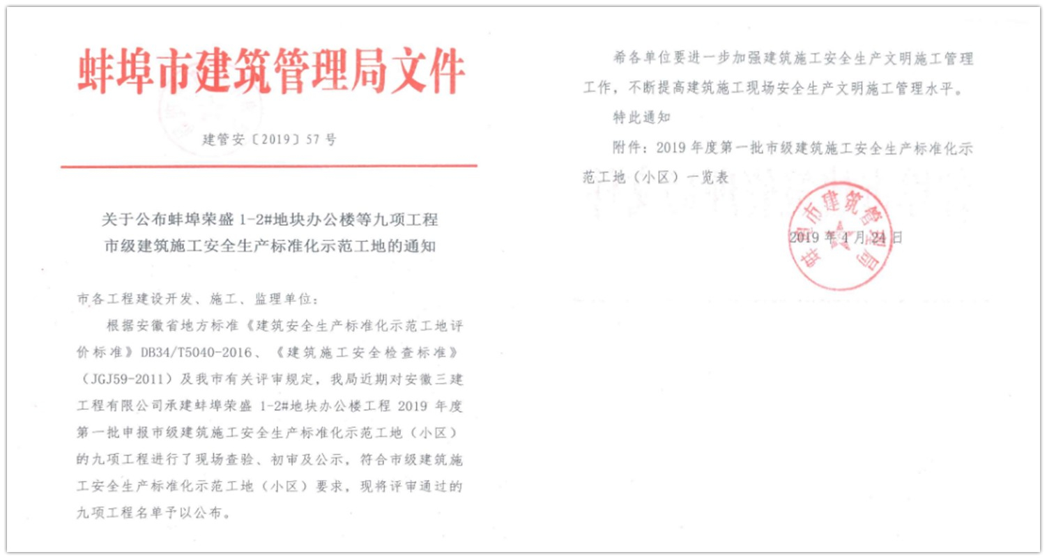 經(jīng)過(guò)集體論證評審,驗收專(zhuān)家組一致認為南城區四期路網(wǎng)項目達到了蚌埠市市級建筑施工安全生產(chǎn)標化示范工地創(chuàng )建工作確定的各項任務(wù)與目標,同意此項目通過(guò)蚌埠市級建筑施工安全生產(chǎn)標準化示范工地驗收。