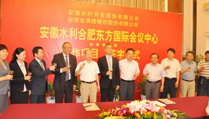 7月6日,安徽水利開(kāi)發(fā)股份有限公司攜手安徽金滿(mǎn)樓餐飲股份有限公司簽約儀式在合肥隆重舉行。肥東縣委書(shū)記楊宏星攜縣縣政府、縣人大、縣政協(xié)及縣直有關(guān)部門(mén)負責同志出席會(huì )議,安徽建工集團黨委副書(shū)記、副董事長(cháng)、總經(jīng)理、安徽水利董事長(cháng)趙時(shí)運出席簽字儀式并致辭,安徽水利常務(wù)副總陳圣剛出席儀式并代表公司簽字,安徽金滿(mǎn)樓餐飲股份董事長(cháng)張青華攜主要負責同志參加了會(huì )議。