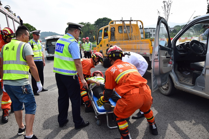 本次演練以模擬交通安全事故為藍本,施工現場(chǎng)管理人員發(fā)現交通事故后報警,交警、消防、醫院急救部門(mén)接警后,迅速組織救援隊伍趕赴事故發(fā)生地點(diǎn)展開(kāi)救援。交警對事故現場(chǎng)進(jìn)行交通疏導和管制,由消防隊員對追尾事故車(chē)輛進(jìn)行破拆,隨后120急救人員對傷員展開(kāi)及時(shí)救治并送往醫院;交警對事故現場(chǎng)進(jìn)行勘查取證,并組織清障車(chē)拖離事故車(chē)輛,清理事故現場(chǎng),恢復道路交通,演練取得圓滿(mǎn)成功。