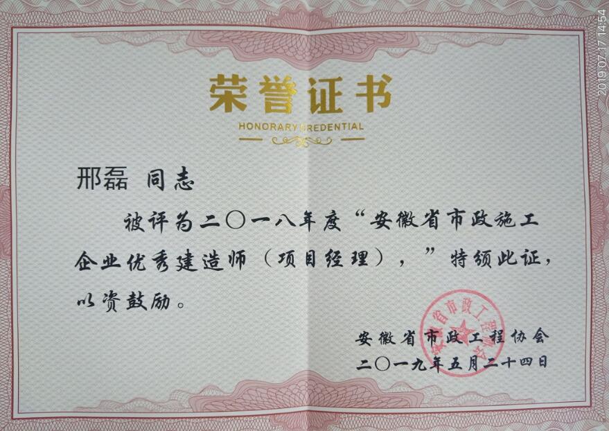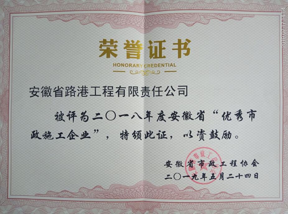 近日,從安徽省市政工程協(xié)會(huì )獲悉,安徽路港公司榮獲2018年度“安徽省優(yōu)秀市政施工企業(yè)”榮譽(yù)稱(chēng)號,公司職工邢磊被評為2018年度“安徽省市政施工企業(yè)優(yōu)秀建造師(項目經(jīng)理)”。