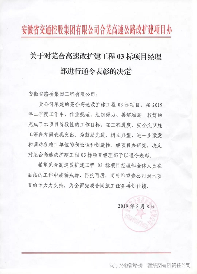 近日,蕪合三標項目部喜獲項目業(yè)主單位通令表彰。業(yè)主單位對蕪合三標作業(yè)規范、組織得力、善解難題,較好的完成項目階段性工作目標給予極大肯定。