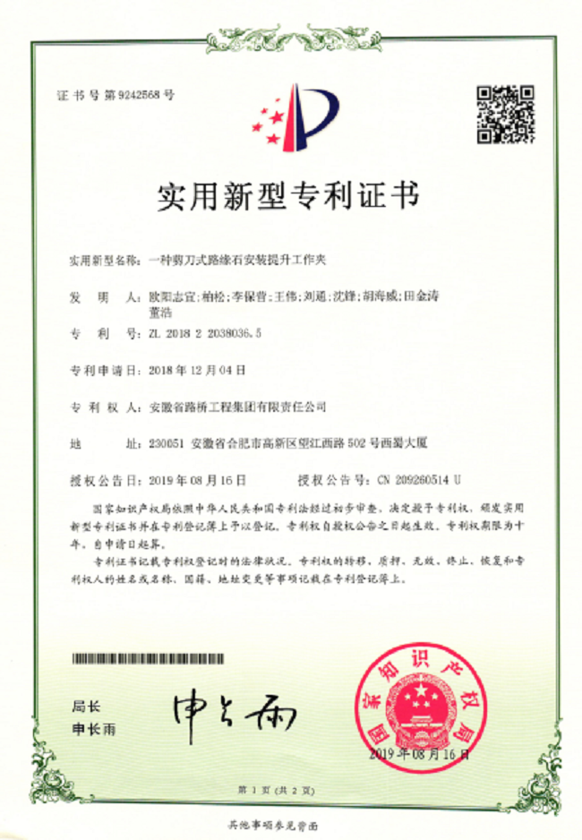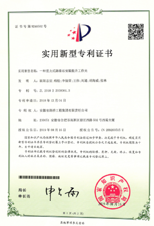 通過(guò)多年來(lái)的努力,公司現已獲得數十項專(zhuān)利成果,在科技創(chuàng )新上取得顯著(zhù)成效。這些專(zhuān)利成果將進(jìn)一步提高公司核心競爭力,為公司的持續發(fā)展提供了強有力的科技支撐,同時(shí)也為公司實(shí)現“安徽建工第一梯隊、安徽省一流交通建設企業(yè)”的發(fā)展目標提供技術(shù)保證。